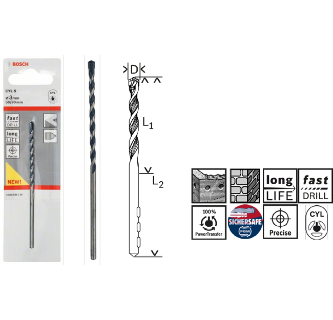 ● CYL-5 Delme Ucu, beton ve taş delmede ekstra uzun dayanıklılık sunar.