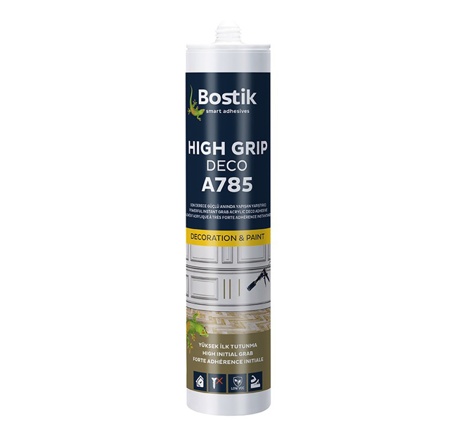 | Bostik A785 HIGH GRIP DECO, iç mekan kullanımına yönelik dekoratif ve yalıtıma yönelik levhalar için anında tutunma sağlayan akrilik dispersiyon bazlı çok amaçlı bir yapıştırıcıdır. Yapıştırıcı, suyun buharlaşması ile kürlenir, güçlü ve dayanaklı bir bağ oluşturur. |