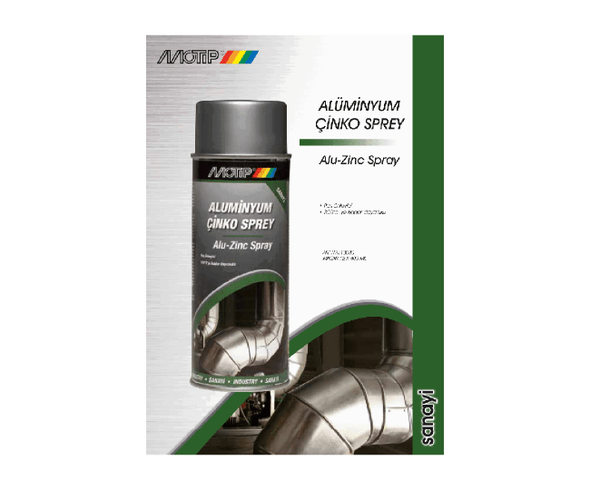 Motip Alüminyum Çinko Spreyi egzostlar ısıtma boruları demir parmaklıklar çitler vs. tüm demir yüzeylere uygulanır. Nakliyede veya tamirat sırasında hasar gören aluminyum veya galvaniz yüzeylerin rötuşlanması için uygundur. Bu sprey aynı zamanda metal yüzeyler ve demir yüzeyler için mükemmel bir korozyon koruyucu olarak da uygundur |